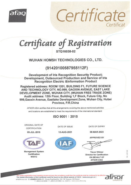 Η Homsh Technologies έχει λάβει τα πιστοποιητικά του Συστήματος Διαχείρισης Ποιότητας, των Προτύπων Συστήματος Διαχείρισης Επαγγελματικής Υγείας και Ασφάλειας,Πρότυπα συστήματος περιβαλλοντικής διαχείρισης και πρότυπα εθνικού συστήματος διαχείρισης της διανοητικής ιδιοκτησίαςΈχει περάσει τις δοκιμές ποιότητας του προϊόντος από τα τμήματα όπως το Εθνικό Κέντρο Ελέγχου για την Ποιότητα των Προϊόντων Συστήματος Ασφάλειας και Ασφάλειας (Πέκινγκ),Εθνικό Κέντρο Ελέγχου Ποιότητας Προϊόντων Συστημάτων Ασφάλειας και Ασφάλειας (Σανγκάη), Guangzhou GRG Metrology & Test co., Ltd και Bell Labs στη Γαλλία.